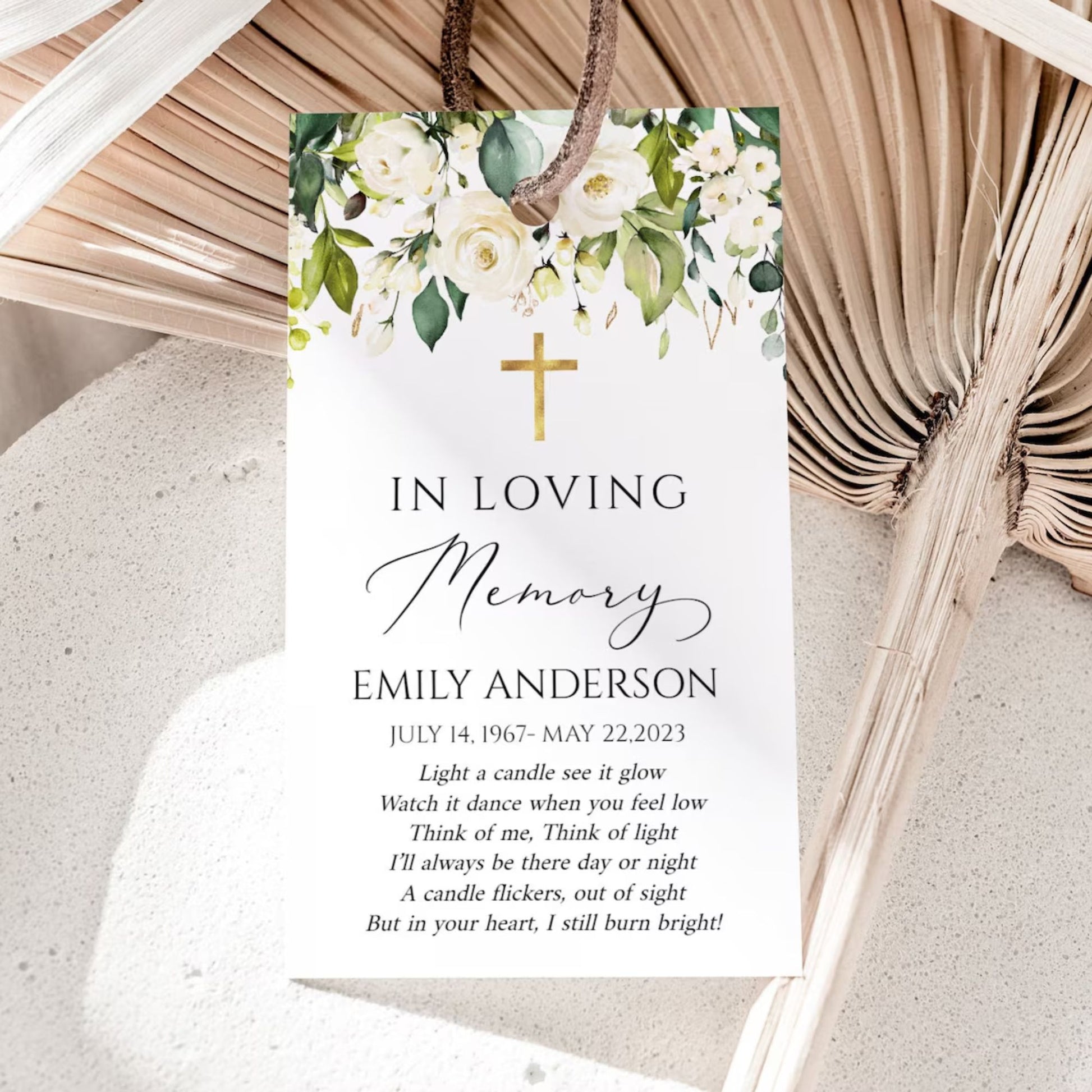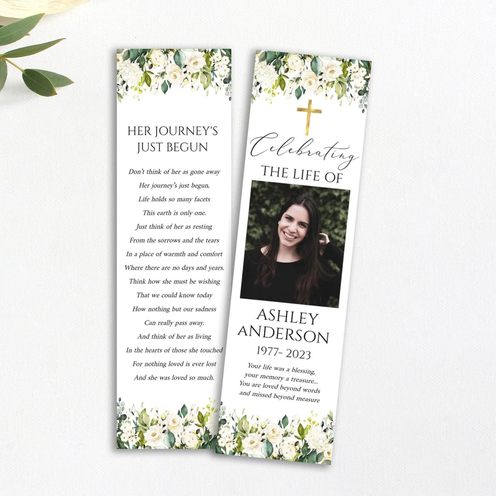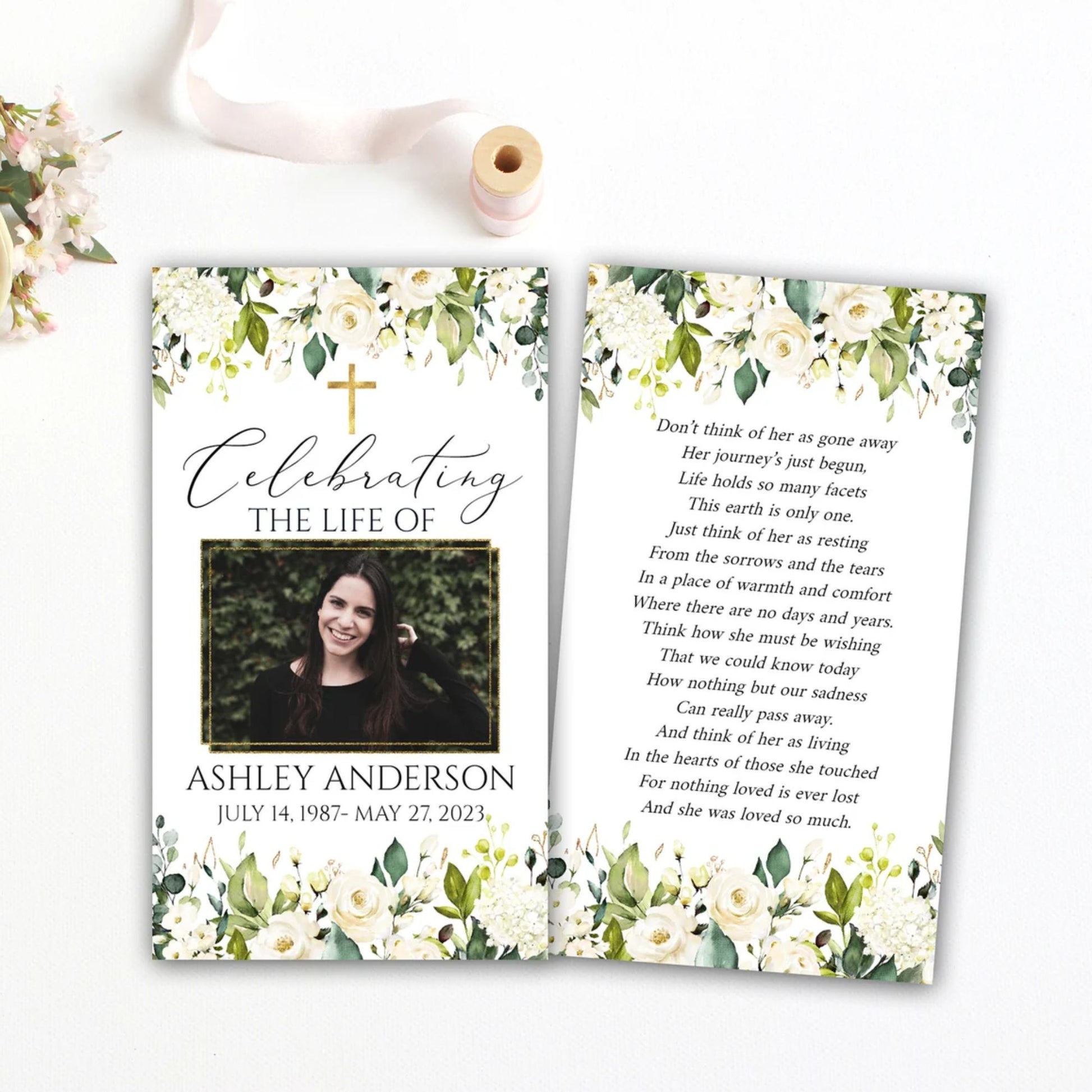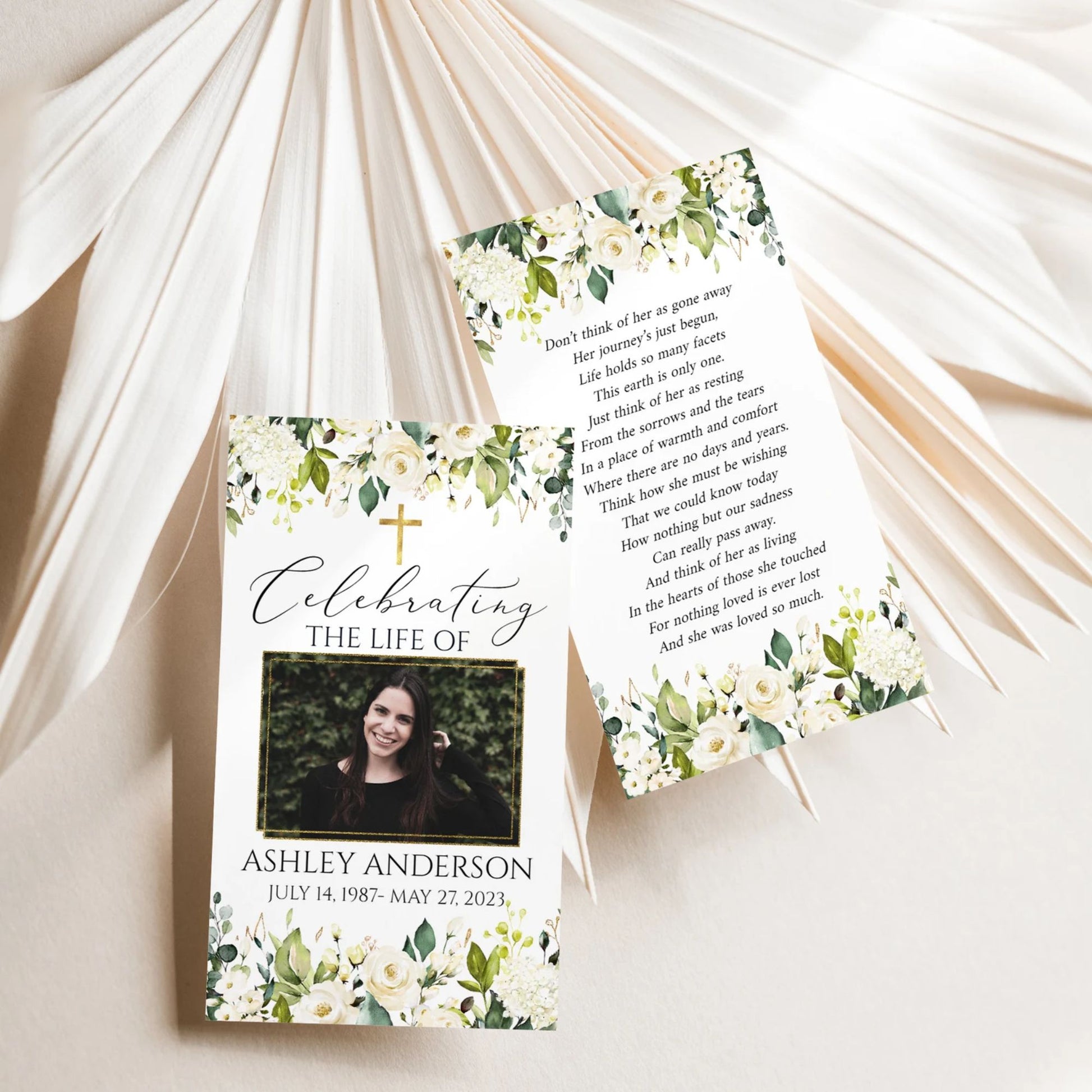This versatile design can be used across all of our memorial pieces, from service booklets and posters to keepsakes, thank-you cards, and complete packages.