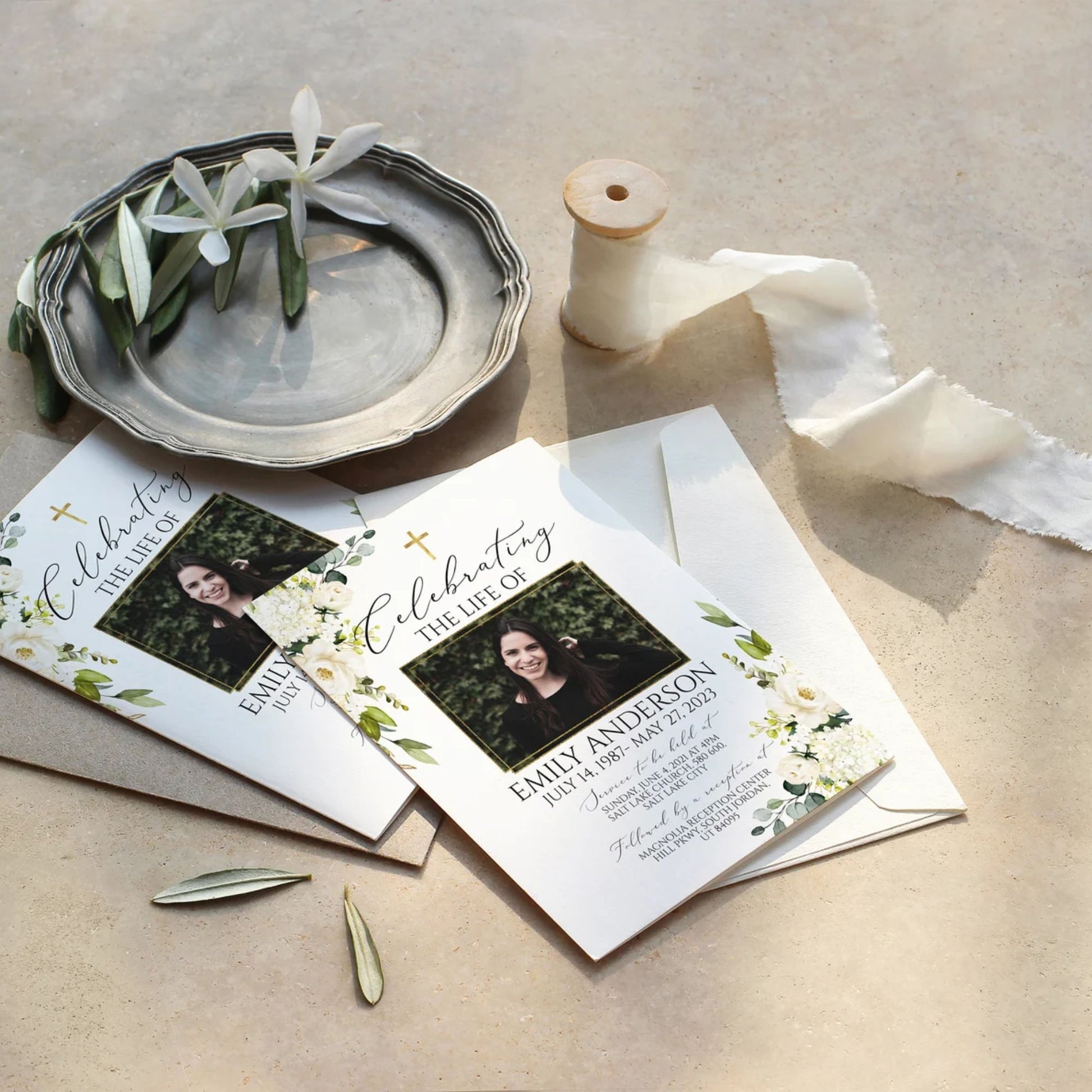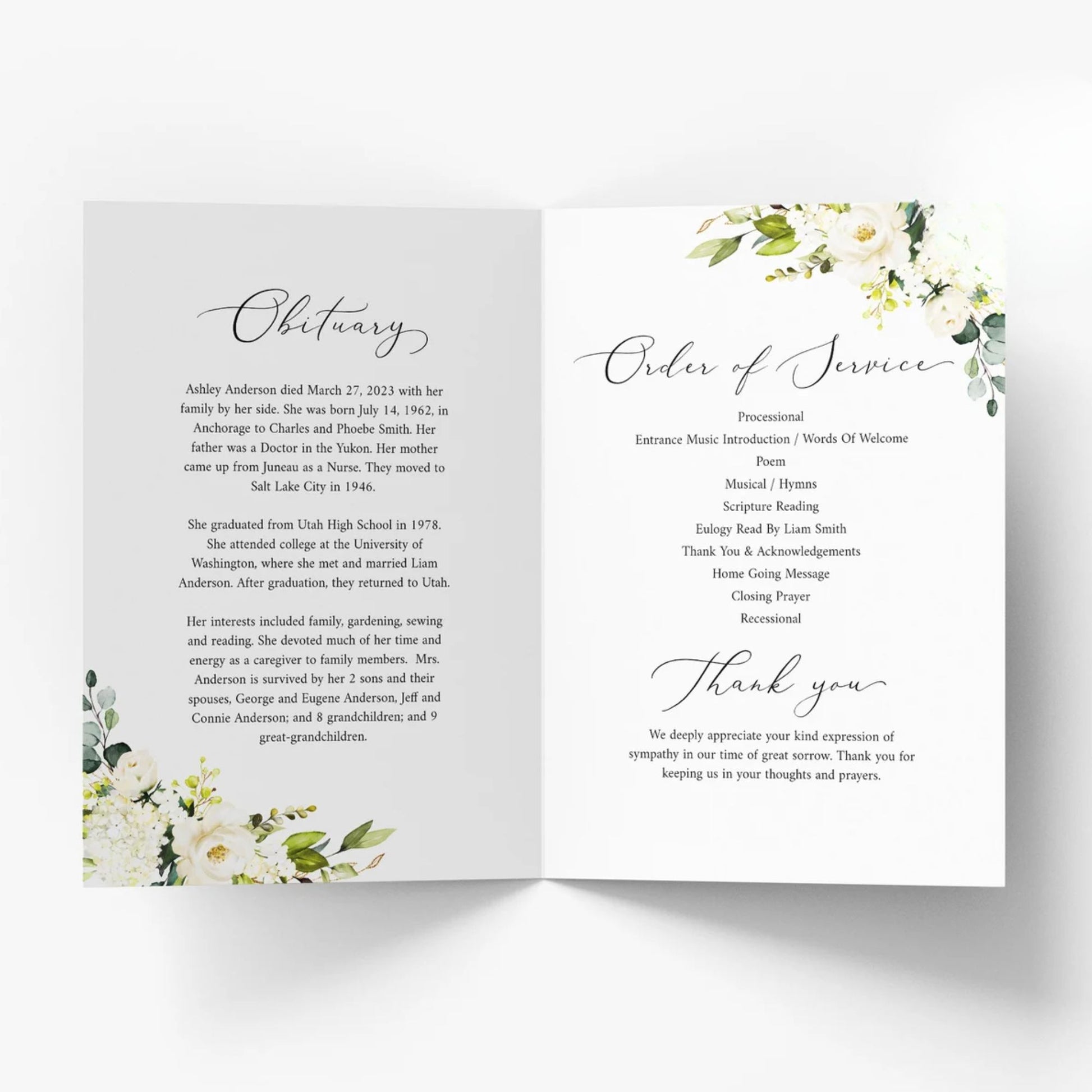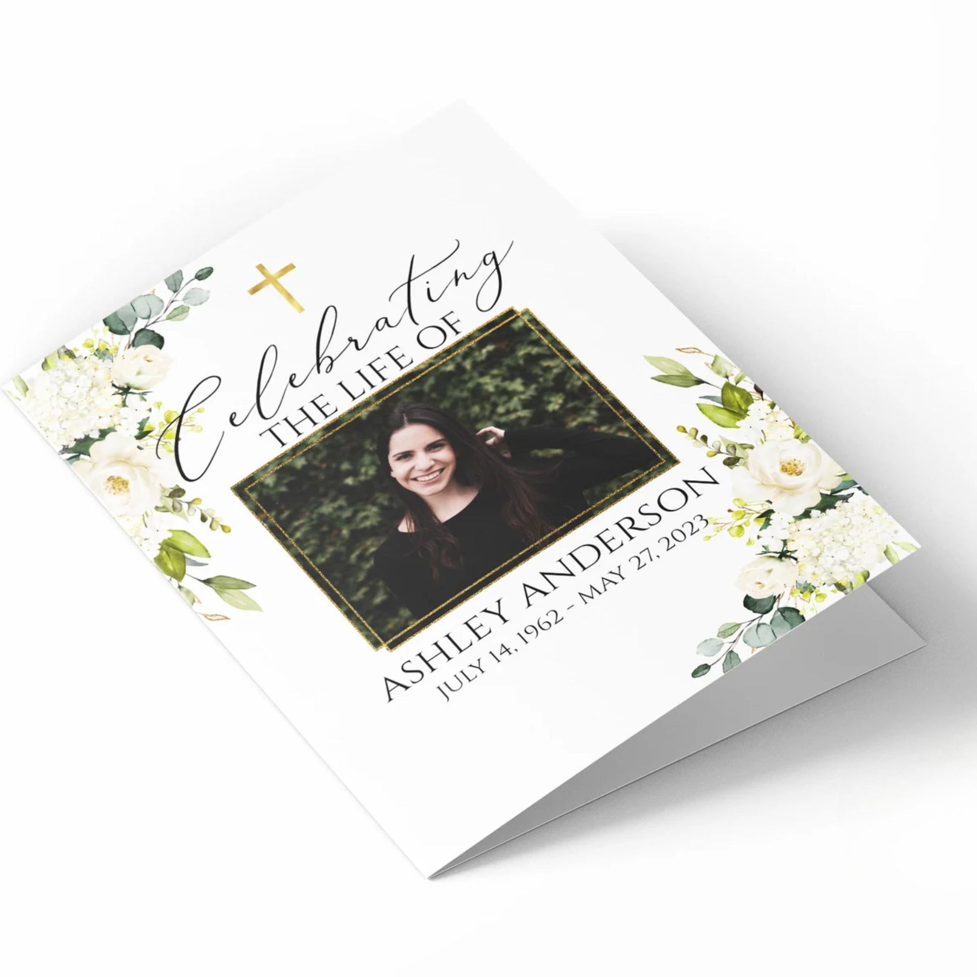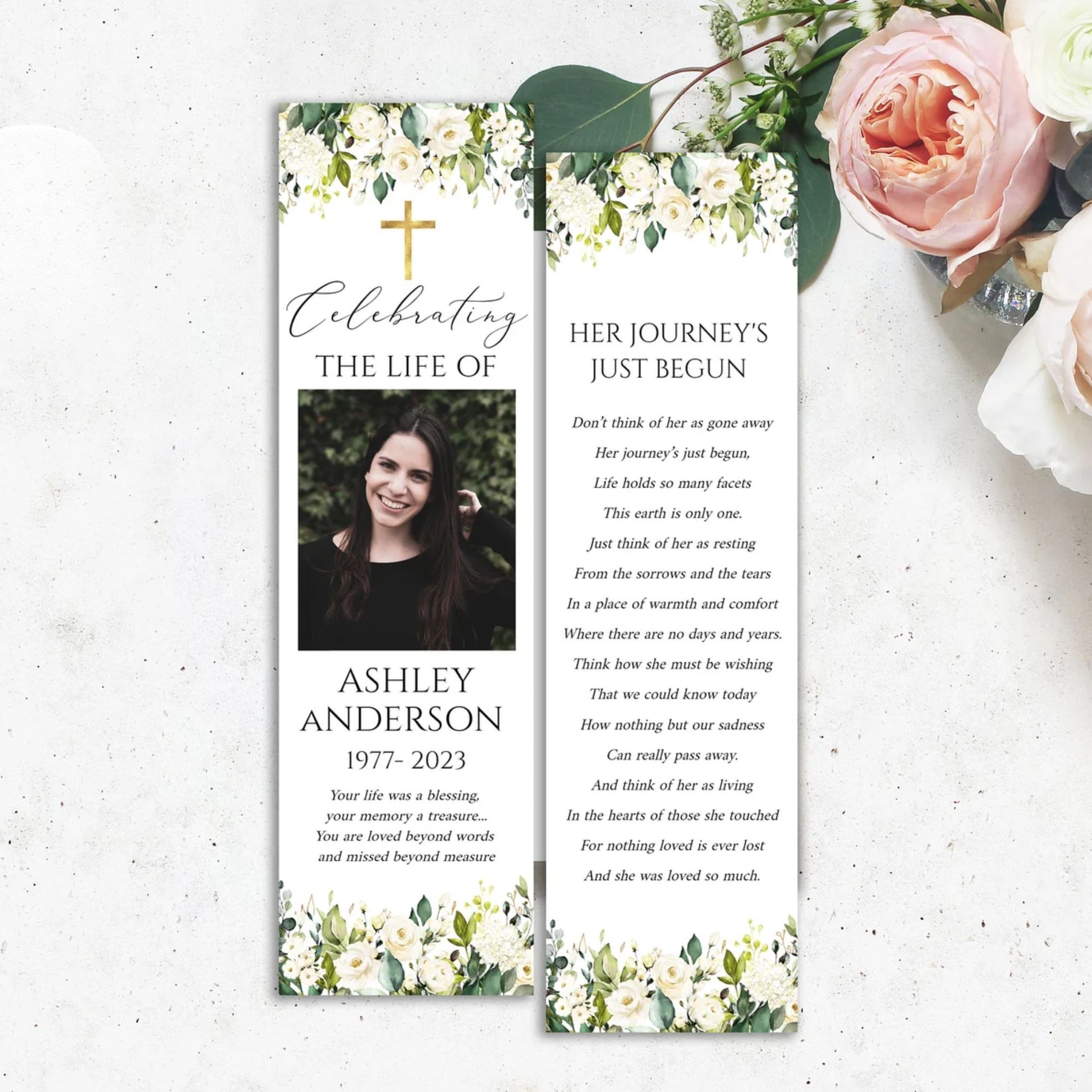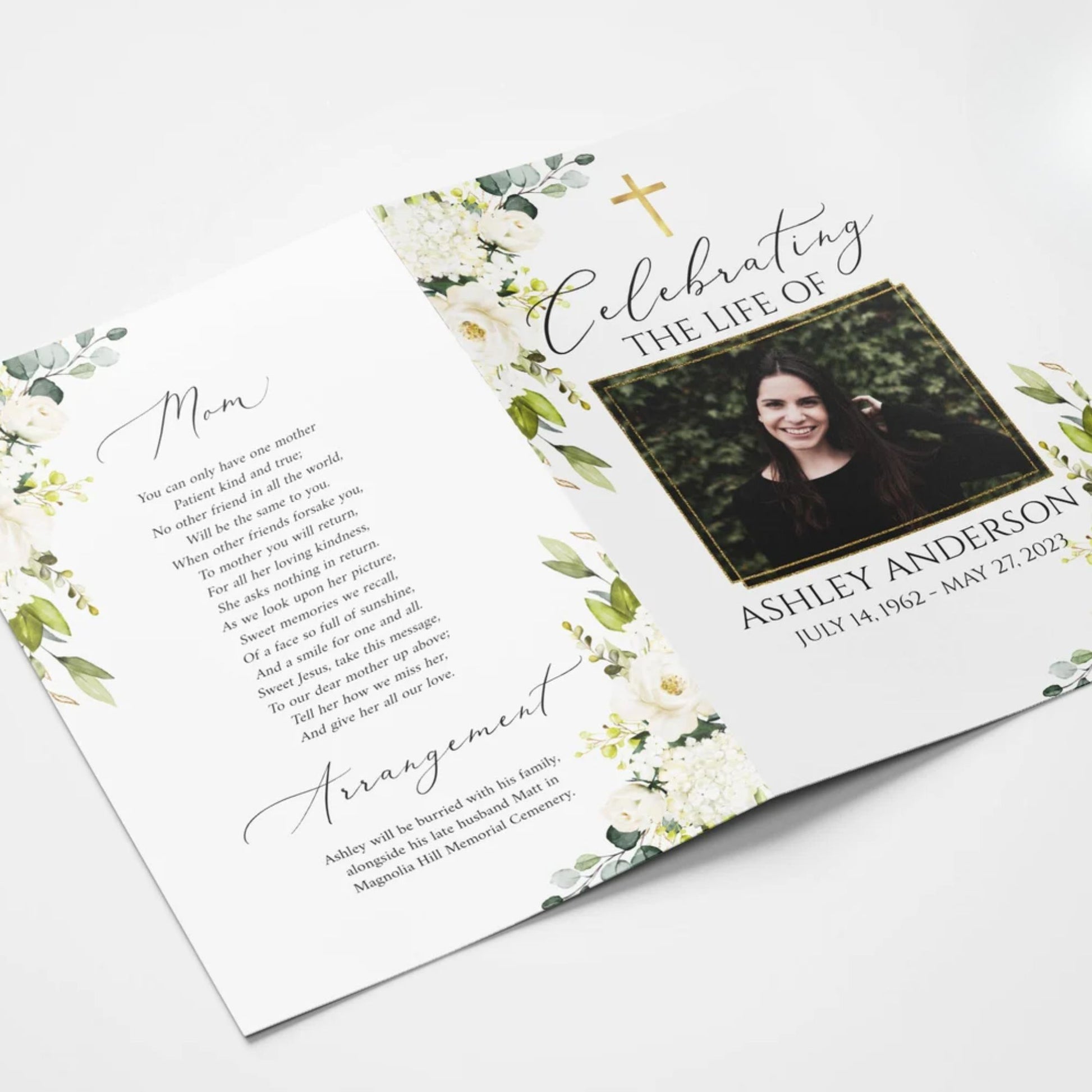 This versatile design can be used across all of our memorial pieces, from service booklets and posters to keepsakes, thank-you cards, and complete packages.