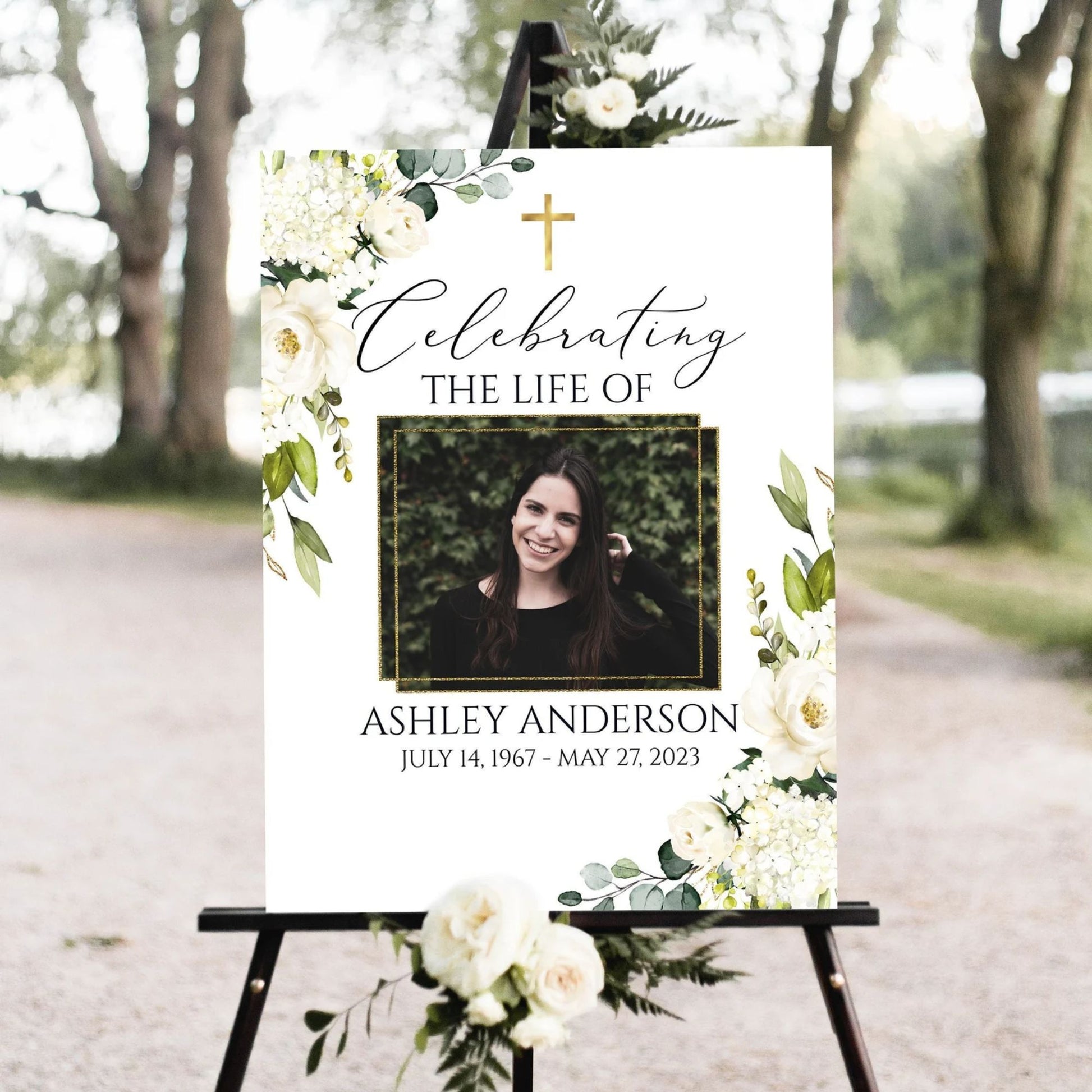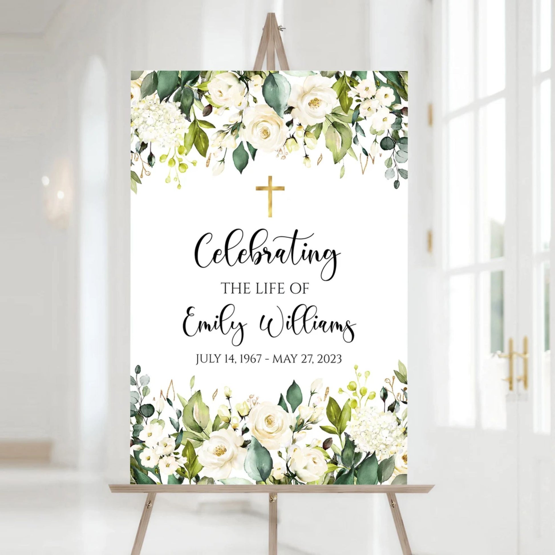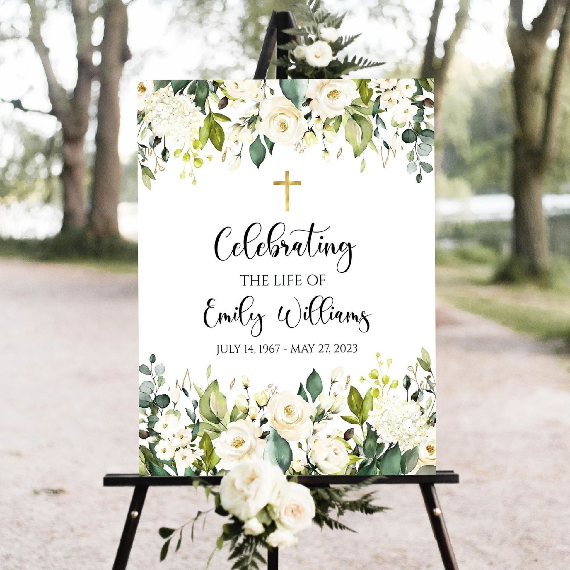 Our Eternal Grace design combines the timeless beauty of a golden cross with soft greenery and elegant white blooms, creating a serene and reverent tribute.