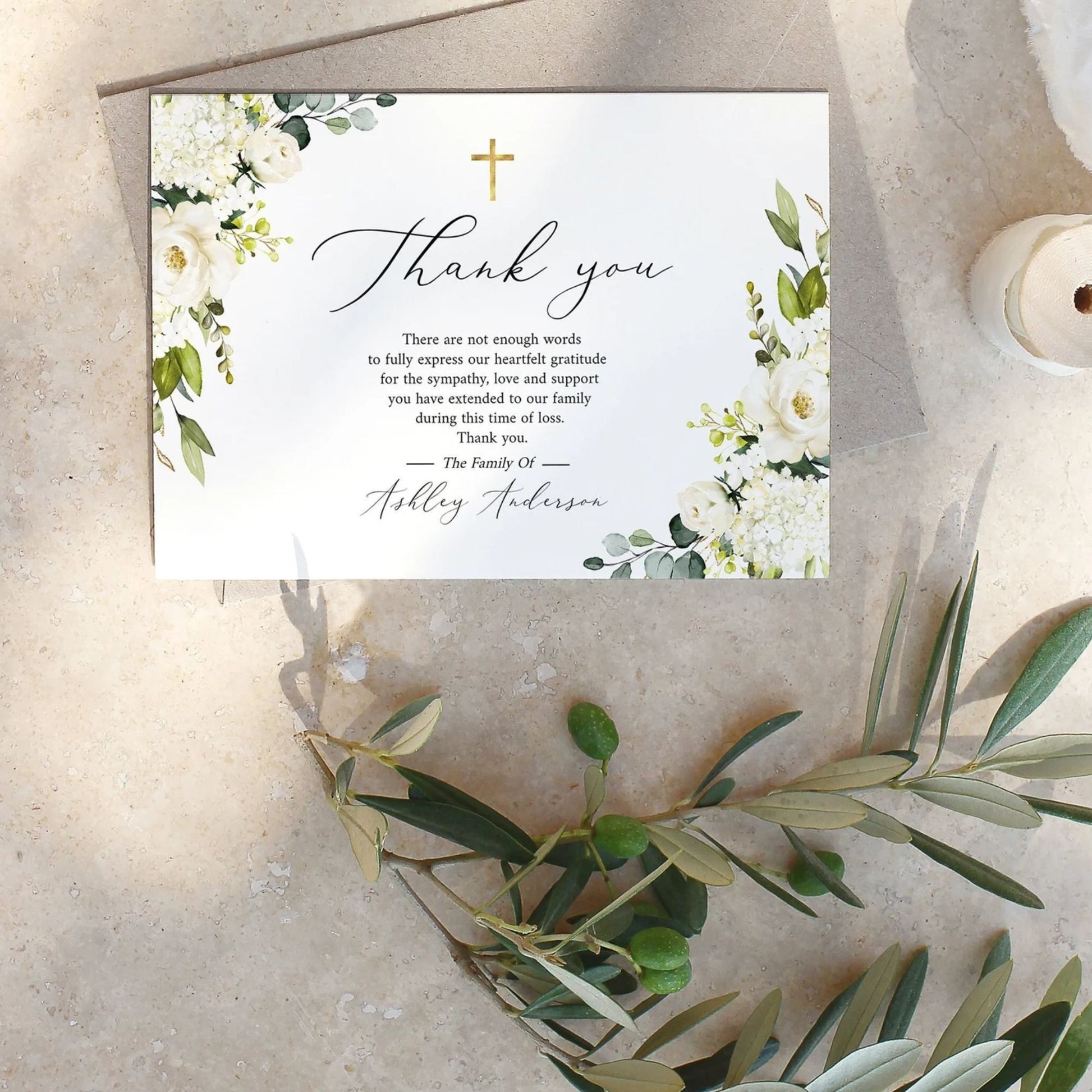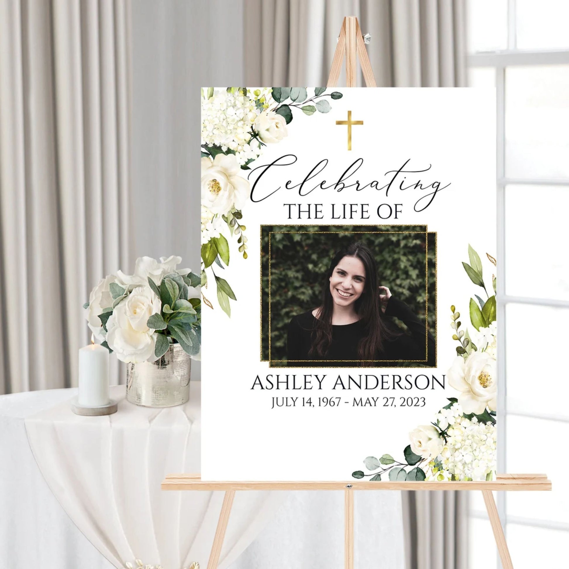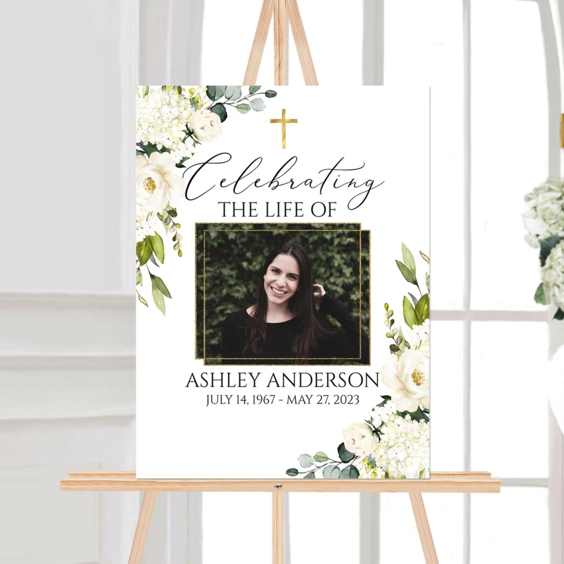 Our Eternal Grace design combines the timeless beauty of a golden cross with soft greenery and elegant white blooms, creating a serene and reverent tribute.