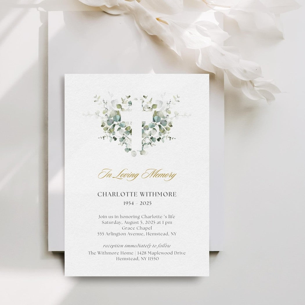 Our Faith & Foliage design blends the timeless beauty of greenery with the symbol of the cross, creating a peaceful and faith-filled tribute.
