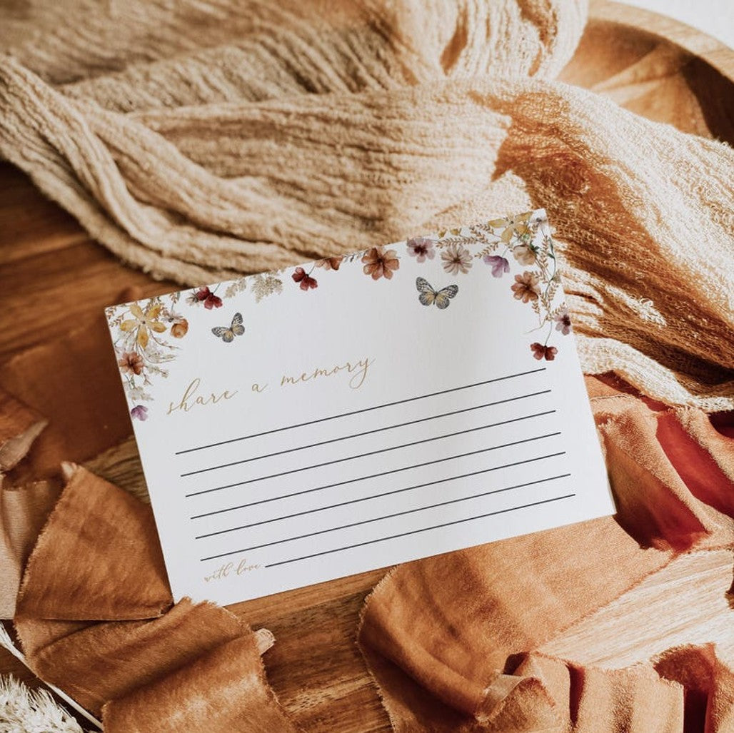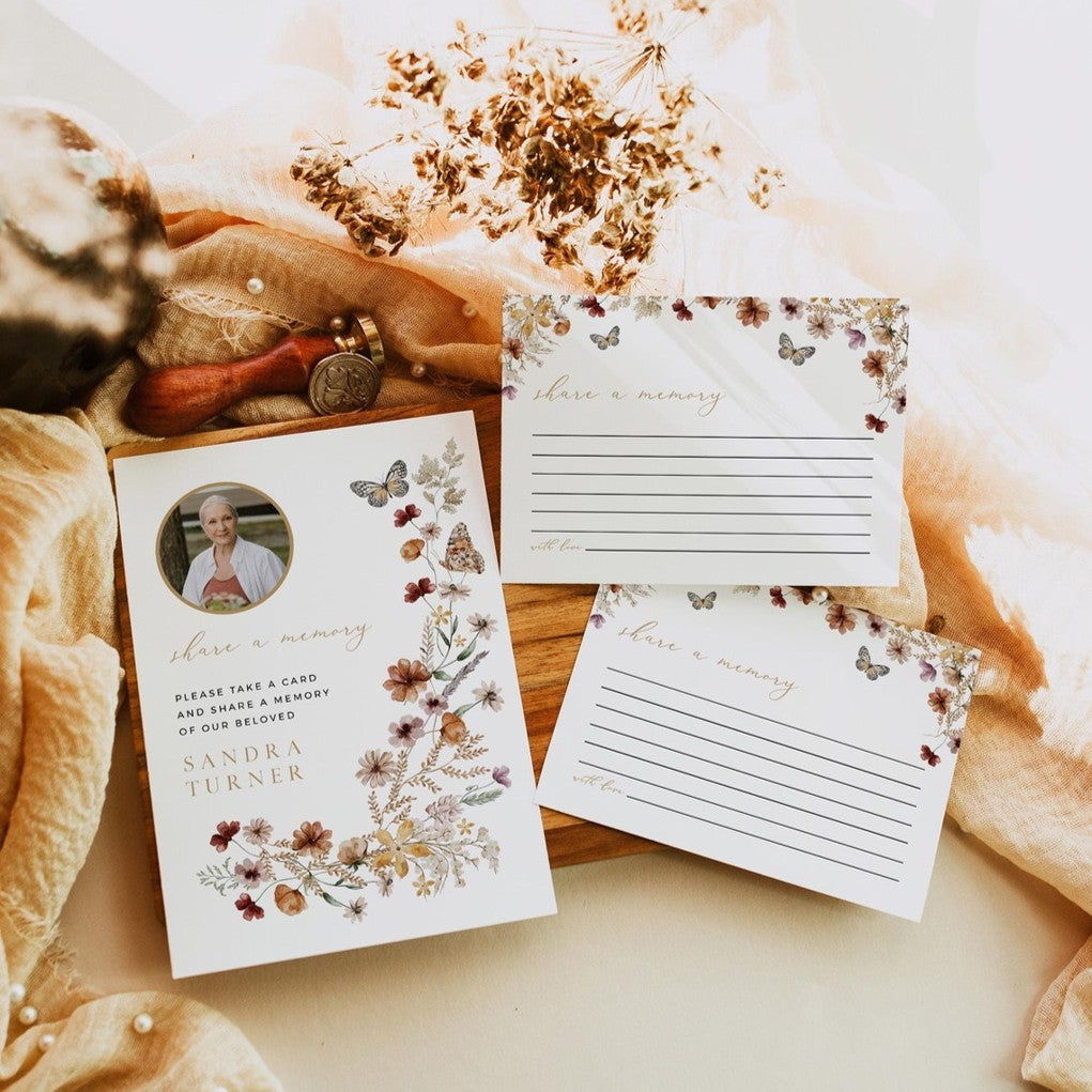 Each card is designed with elegance and simplicity, providing space for personal reflections. A matching “Share a Memory” sign is also included, inviting guests to contribute to this lasting tribute of love and remembrance.