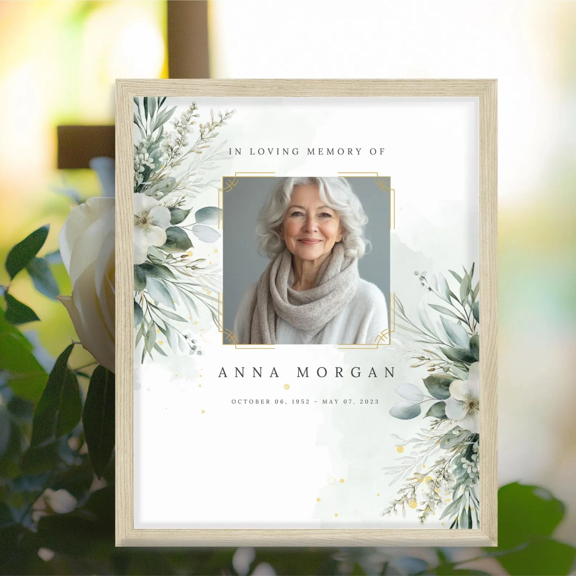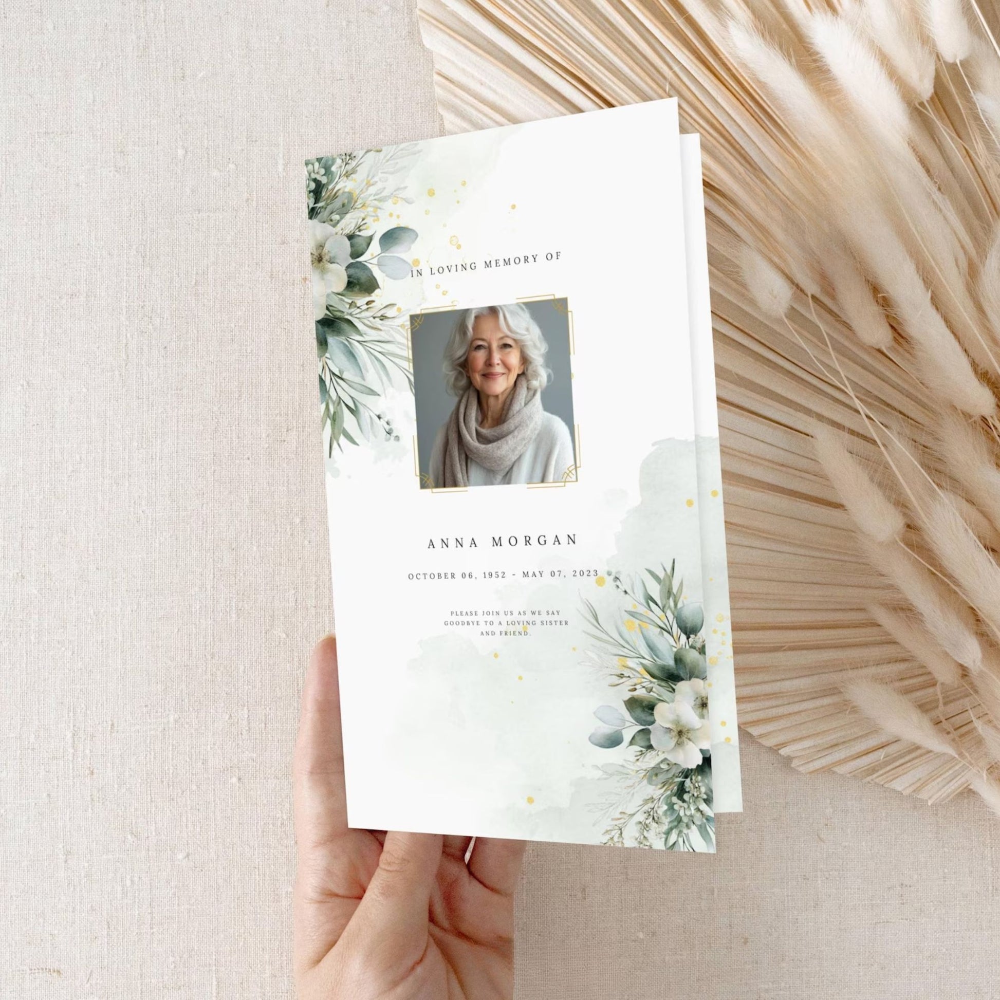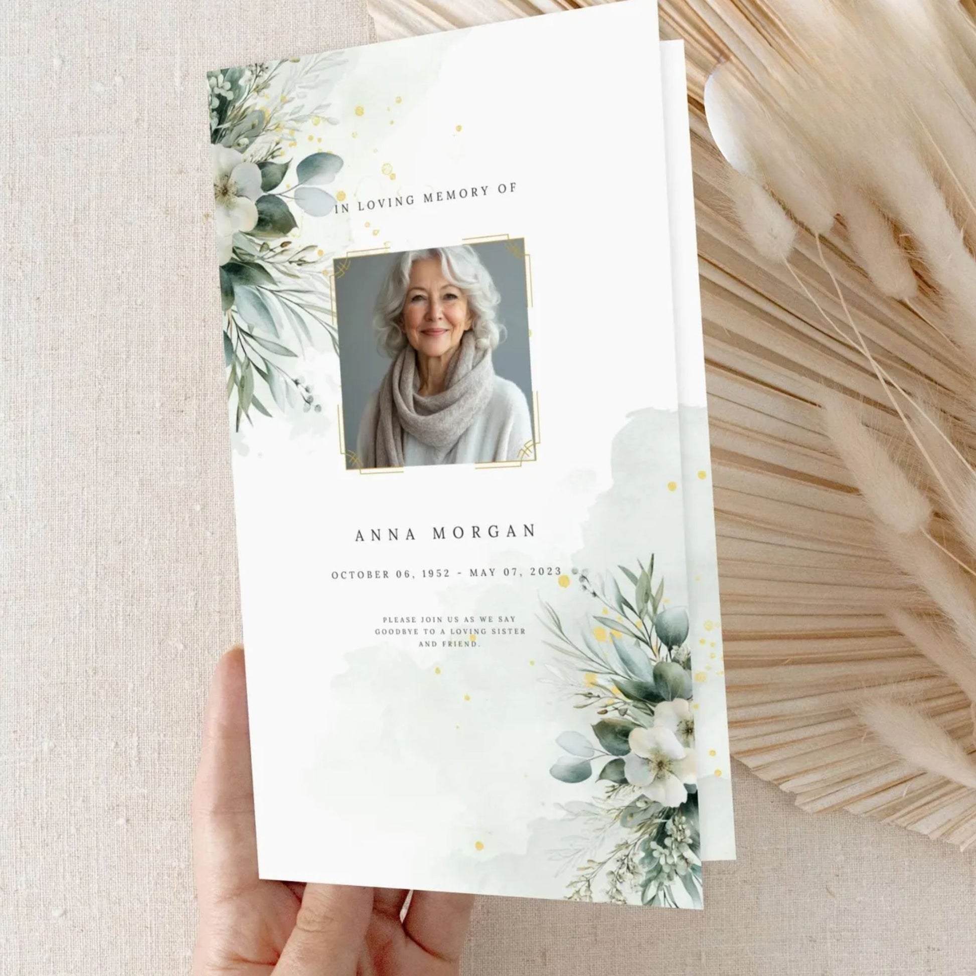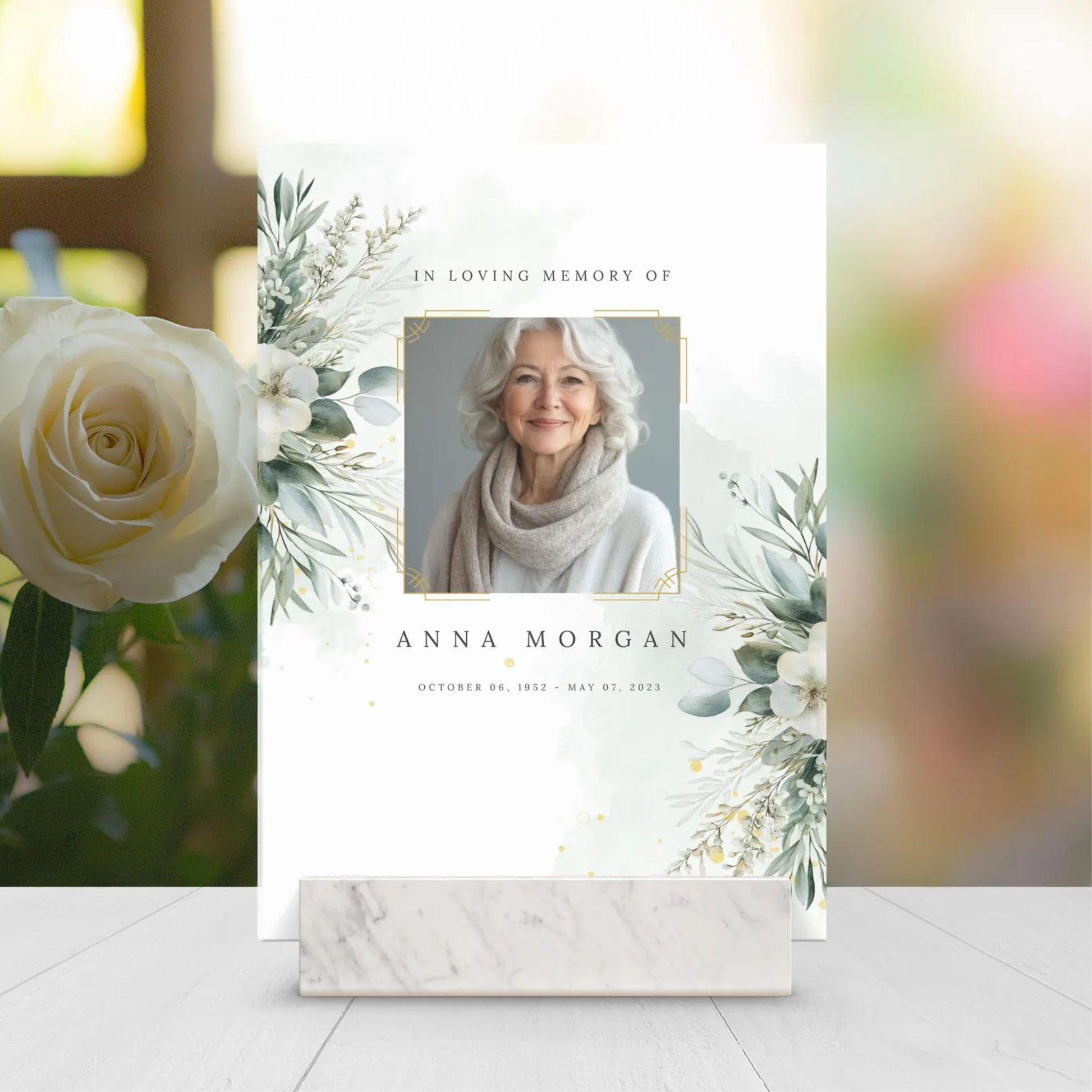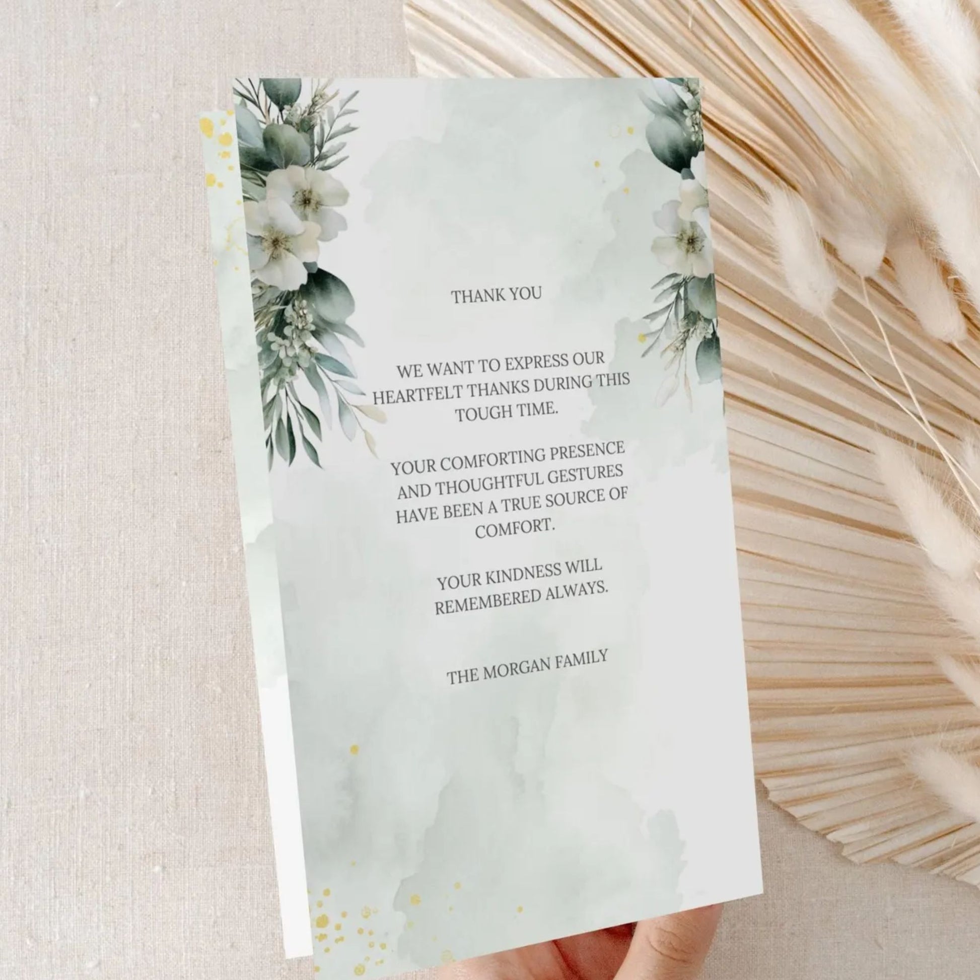 Our Botanica design evokes the soft, calming beauty of sage-toned watercolour, delicate white blooms, and gentle greenery, creating a serene and heartfelt tribute.